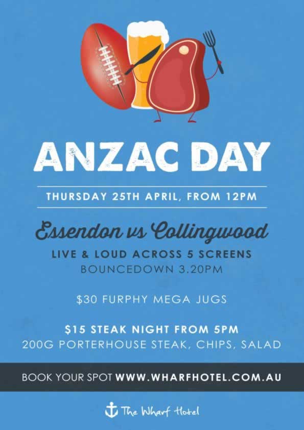 Get your ANZAC day footy fix at the Wharf Hotel with the big game between Collingwood & Essendon shown LIVE across 5 big screens. Enjoy specials including Furphy Mega Jugs. Plus Steak Night from 5pm.